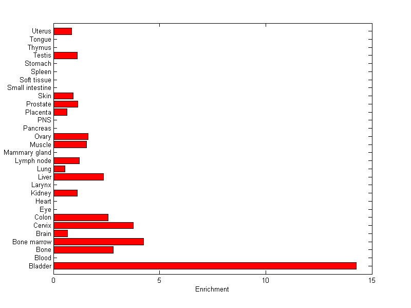 The expression level is normalized with tissue-library size. Each value for a gene in a tissue is a ratio of observed ESTs to the expected one in this tissue. The expected number of ESTs is the product of total ESTs of the gene and the fraction of total ESTs in the tissue among all ESTs in 30 tissues.