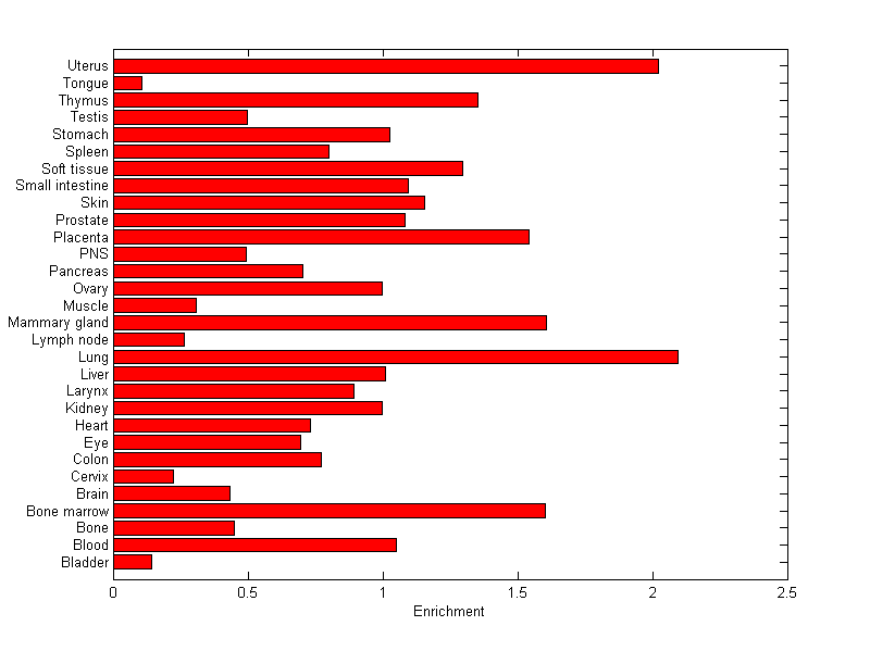 The expression level is normalized with tissue-library size. Each value for a gene in a tissue is a ratio of observed ESTs to the expected one in this tissue. The expected number of ESTs is the product of total ESTs of the gene and the fraction of total ESTs in the tissue among all ESTs in 30 tissues.