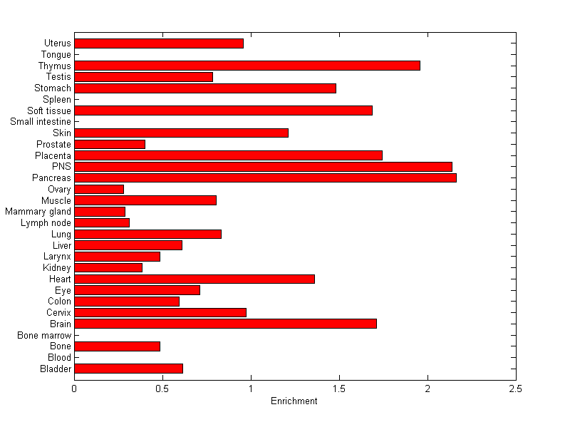 The expression level is normalized with tissue-library size. Each value for a gene in a tissue is a ratio of observed ESTs to the expected one in this tissue. The expected number of ESTs is the product of total ESTs of the gene and the fraction of total ESTs in the tissue among all ESTs in 30 tissues.