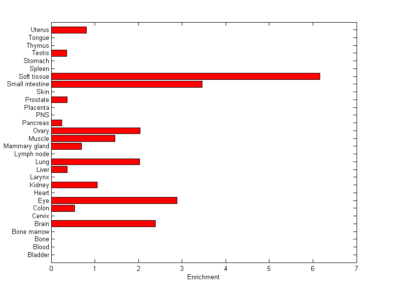 The expression level is normalized with tissue-library size. Each value for a gene in a tissue is a ratio of observed ESTs to the expected one in this tissue. The expected number of ESTs is the product of total ESTs of the gene and the fraction of total ESTs in the tissue among all ESTs in 30 tissues.
