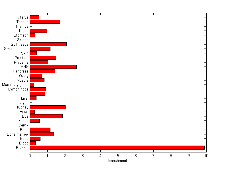 The expression level is normalized with tissue-library size. Each value for a gene in a tissue is a ratio of observed ESTs to the expected one in this tissue. The expected number of ESTs is the product of total ESTs of the gene and the fraction of total ESTs in the tissue among all ESTs in 30 tissues.