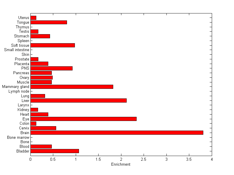 The expression level is normalized with tissue-library size. Each value for a gene in a tissue is a ratio of observed ESTs to the expected one in this tissue. The expected number of ESTs is the product of total ESTs of the gene and the fraction of total ESTs in the tissue among all ESTs in 30 tissues.