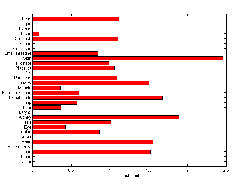 The expression level is normalized with tissue-library size. Each value for a gene in a tissue is a ratio of observed ESTs to the expected one in this tissue. The expected number of ESTs is the product of total ESTs of the gene and the fraction of total ESTs in the tissue among all ESTs in 30 tissues.