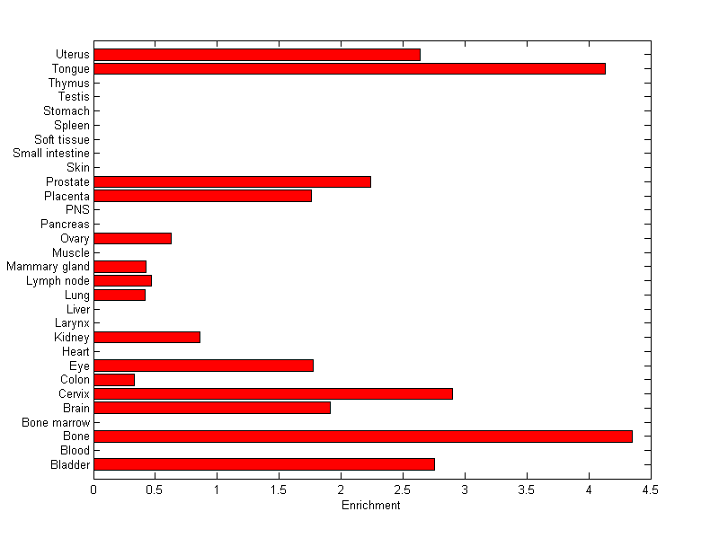 The expression level is normalized with tissue-library size. Each value for a gene in a tissue is a ratio of observed ESTs to the expected one in this tissue. The expected number of ESTs is the product of total ESTs of the gene and the fraction of total ESTs in the tissue among all ESTs in 30 tissues.