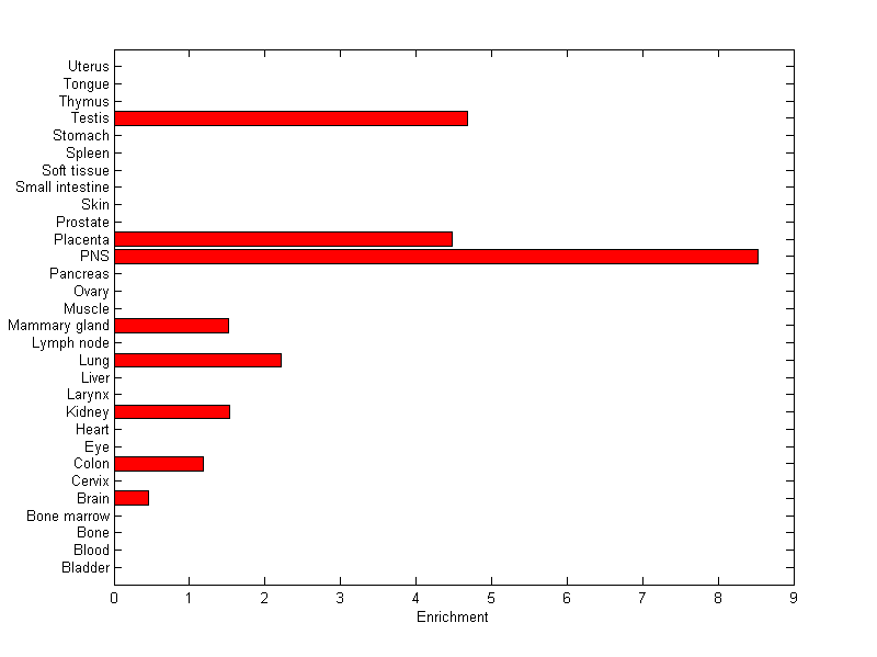 The expression level is normalized with tissue-library size. Each value for a gene in a tissue is a ratio of observed ESTs to the expected one in this tissue. The expected number of ESTs is the product of total ESTs of the gene and the fraction of total ESTs in the tissue among all ESTs in 30 tissues.