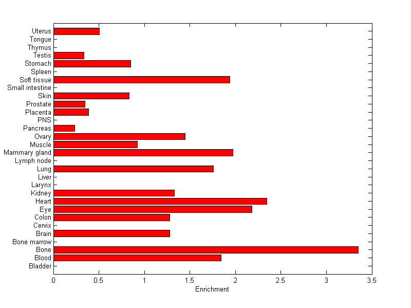 The expression level is normalized with tissue-library size. Each value for a gene in a tissue is a ratio of observed ESTs to the expected one in this tissue. The expected number of ESTs is the product of total ESTs of the gene and the fraction of total ESTs in the tissue among all ESTs in 30 tissues.