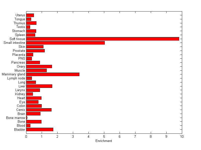 About the profile: The expression level is normalized with tissue-library size. Each value for a gene in a tissue is a ratio of observed ESTs to the expected one in this tissue. The expected number of ESTs is the product of total ESTs of the gene and the fraction of total ESTs in the tissue among all ESTs in 30 tissues. Summary: This gene is preferentially expressed in [small_intestine, soft_tissue] Download: |