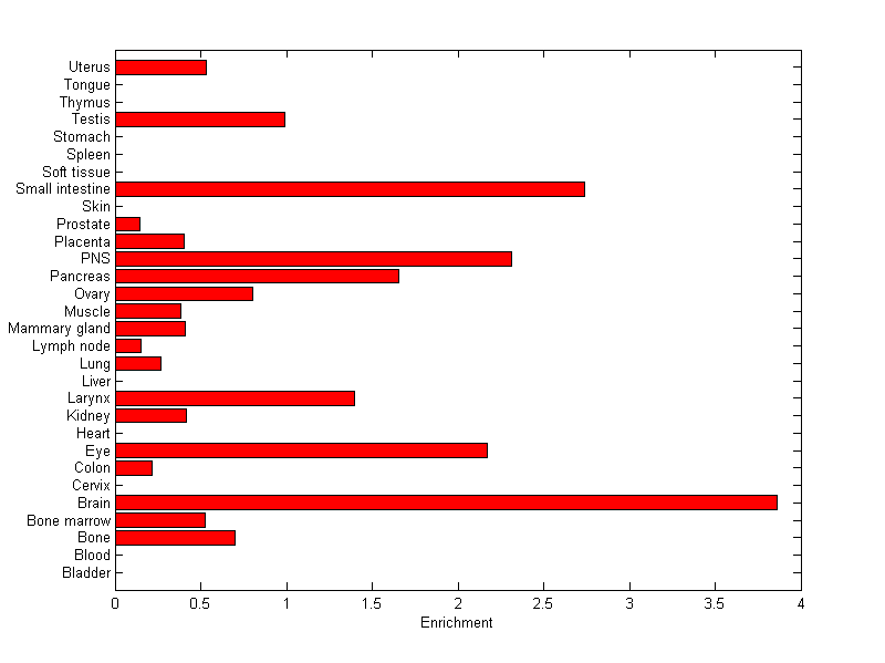 The expression level is normalized with tissue-library size. Each value for a gene in a tissue is a ratio of observed ESTs to the expected one in this tissue. The expected number of ESTs is the product of total ESTs of the gene and the fraction of total ESTs in the tissue among all ESTs in 30 tissues.