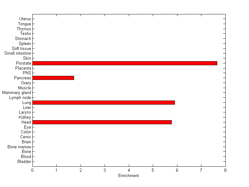 About the profile: The expression level is normalized with tissue-library size. Each value for a gene in a tissue is a ratio of observed ESTs to the expected one in this tissue. The expected number of ESTs is the product of total ESTs of the gene and the fraction of total ESTs in the tissue among all ESTs in 30 tissues. Summary: This gene is preferentially expressed in [lung, prostate] Download: |