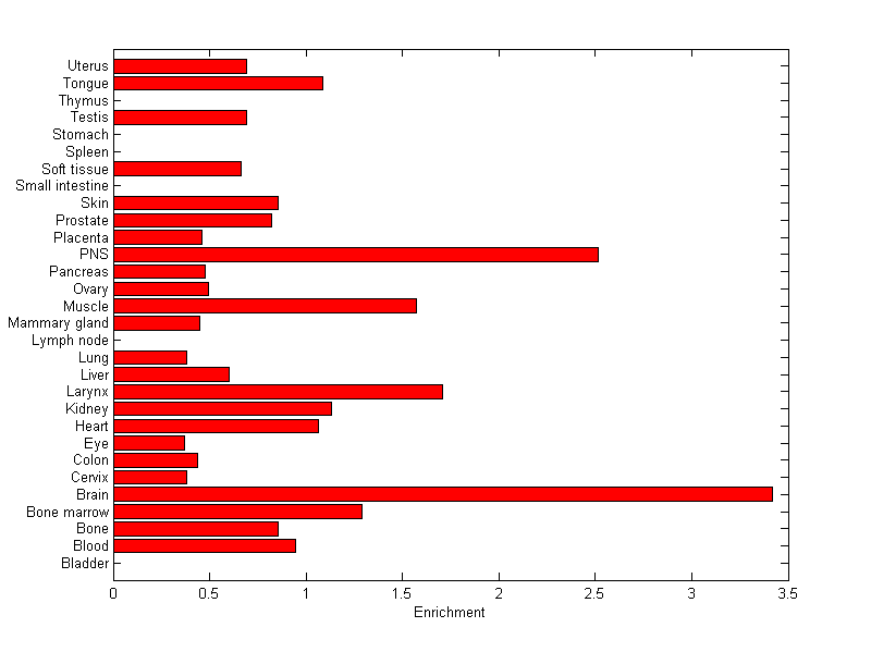 The expression level is normalized with tissue-library size. Each value for a gene in a tissue is a ratio of observed ESTs to the expected one in this tissue. The expected number of ESTs is the product of total ESTs of the gene and the fraction of total ESTs in the tissue among all ESTs in 30 tissues.