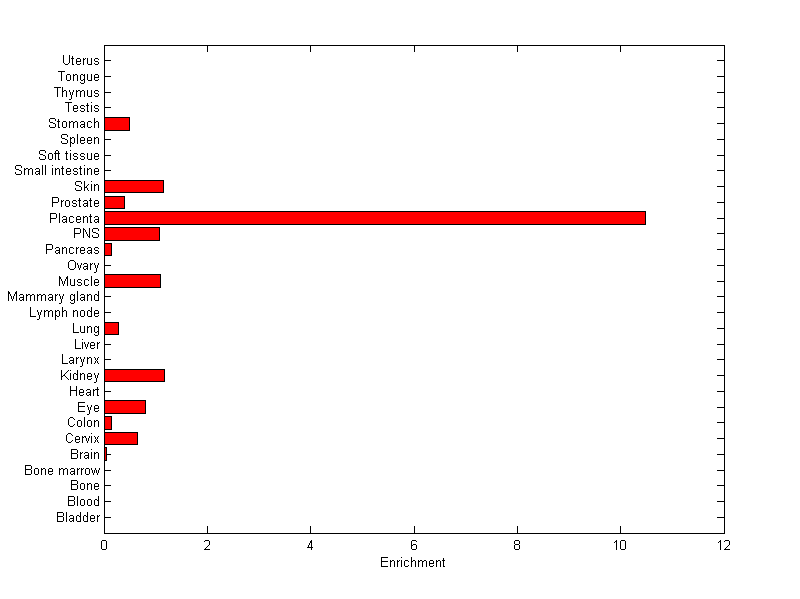 About the profile: The expression level is normalized with tissue-library size. Each value for a gene in a tissue is a ratio of observed ESTs to the expected one in this tissue. The expected number of ESTs is the product of total ESTs of the gene and the fraction of total ESTs in the tissue among all ESTs in 30 tissues. Summary: This gene is preferentially expressed in [placenta] Download: |