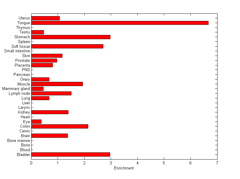The expression level is normalized with tissue-library size. Each value for a gene in a tissue is a ratio of observed ESTs to the expected one in this tissue. The expected number of ESTs is the product of total ESTs of the gene and the fraction of total ESTs in the tissue among all ESTs in 30 tissues.