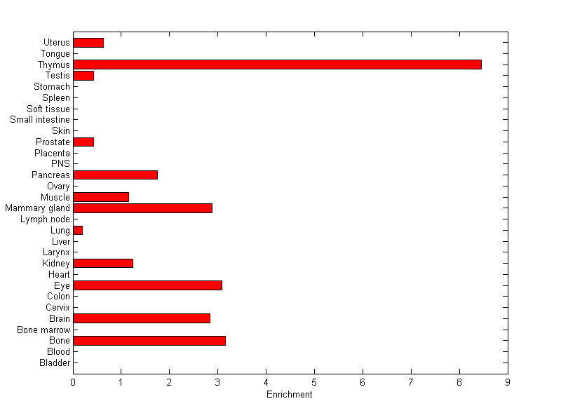 The expression level is normalized with tissue-library size. Each value for a gene in a tissue is a ratio of observed ESTs to the expected one in this tissue. The expected number of ESTs is the product of total ESTs of the gene and the fraction of total ESTs in the tissue among all ESTs in 30 tissues.