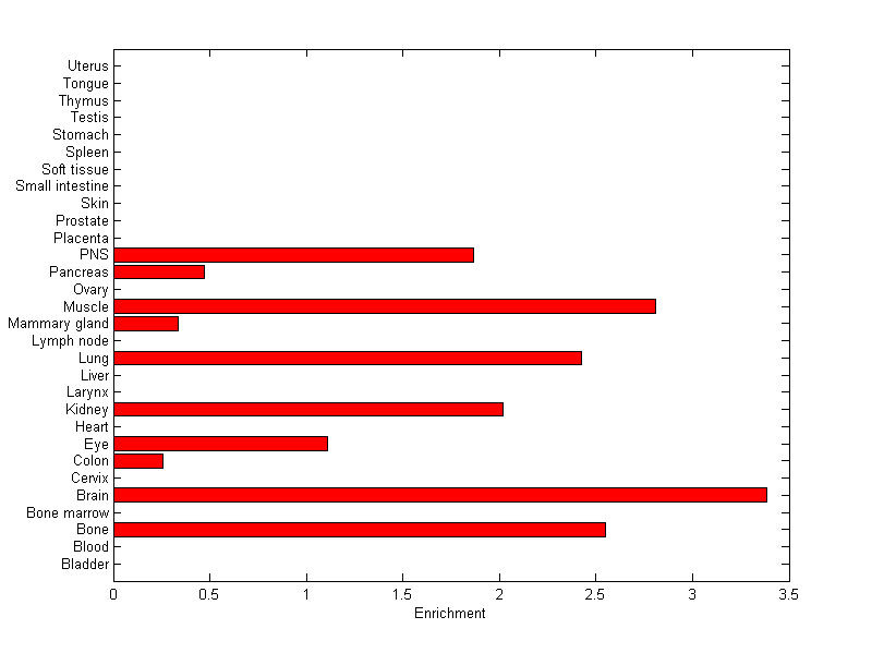 The expression level is normalized with tissue-library size. Each value for a gene in a tissue is a ratio of observed ESTs to the expected one in this tissue. The expected number of ESTs is the product of total ESTs of the gene and the fraction of total ESTs in the tissue among all ESTs in 30 tissues.