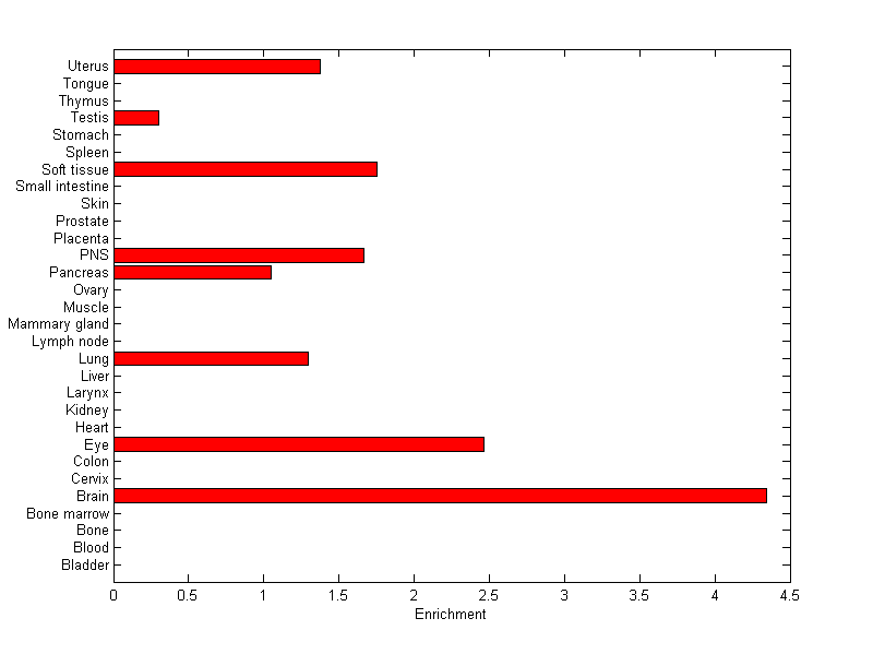 The expression level is normalized with tissue-library size. Each value for a gene in a tissue is a ratio of observed ESTs to the expected one in this tissue. The expected number of ESTs is the product of total ESTs of the gene and the fraction of total ESTs in the tissue among all ESTs in 30 tissues.