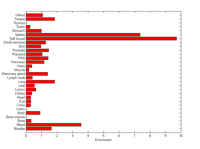 About the profile: The expression level is normalized with tissue-library size. Each value for a gene in a tissue is a ratio of observed ESTs to the expected one in this tissue. The expected number of ESTs is the product of total ESTs of the gene and the fraction of total ESTs in the tissue among all ESTs in 30 tissues. Summary: This gene is preferentially expressed in [soft_tissue, spleen] Download: |