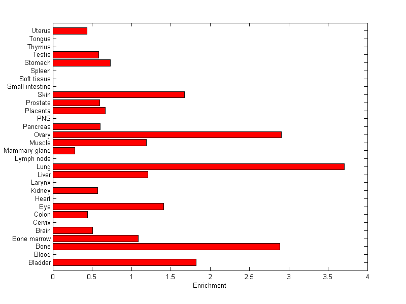 The expression level is normalized with tissue-library size. Each value for a gene in a tissue is a ratio of observed ESTs to the expected one in this tissue. The expected number of ESTs is the product of total ESTs of the gene and the fraction of total ESTs in the tissue among all ESTs in 30 tissues.