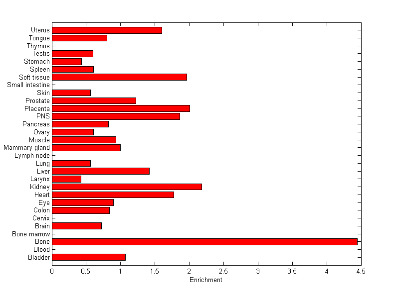 The expression level is normalized with tissue-library size. Each value for a gene in a tissue is a ratio of observed ESTs to the expected one in this tissue. The expected number of ESTs is the product of total ESTs of the gene and the fraction of total ESTs in the tissue among all ESTs in 30 tissues.