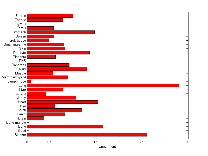 The expression level is normalized with tissue-library size. Each value for a gene in a tissue is a ratio of observed ESTs to the expected one in this tissue. The expected number of ESTs is the product of total ESTs of the gene and the fraction of total ESTs in the tissue among all ESTs in 30 tissues.