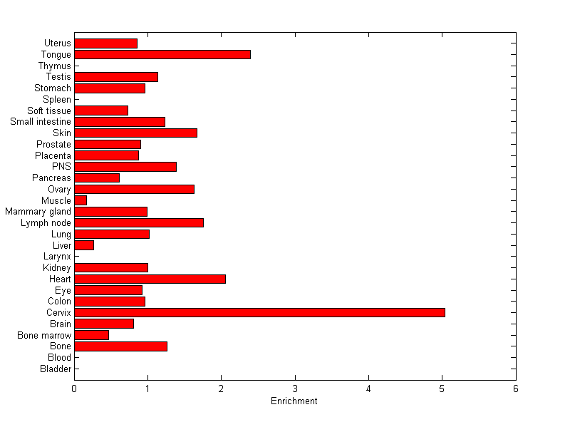 The expression level is normalized with tissue-library size. Each value for a gene in a tissue is a ratio of observed ESTs to the expected one in this tissue. The expected number of ESTs is the product of total ESTs of the gene and the fraction of total ESTs in the tissue among all ESTs in 30 tissues.