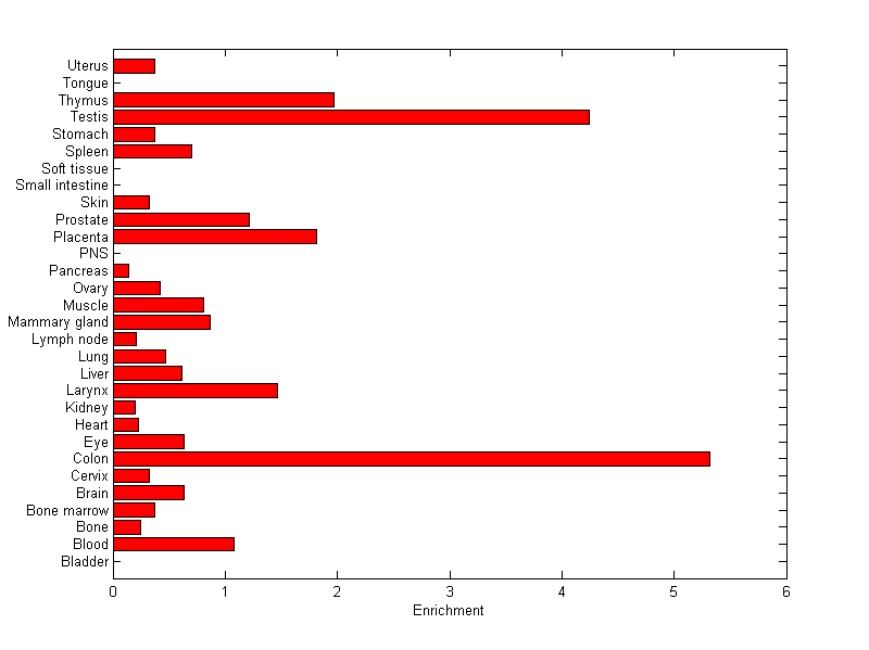 The expression level is normalized with tissue-library size. Each value for a gene in a tissue is a ratio of observed ESTs to the expected one in this tissue. The expected number of ESTs is the product of total ESTs of the gene and the fraction of total ESTs in the tissue among all ESTs in 30 tissues.