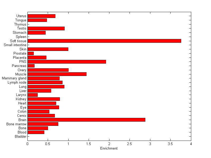 The expression level is normalized with tissue-library size. Each value for a gene in a tissue is a ratio of observed ESTs to the expected one in this tissue. The expected number of ESTs is the product of total ESTs of the gene and the fraction of total ESTs in the tissue among all ESTs in 30 tissues.