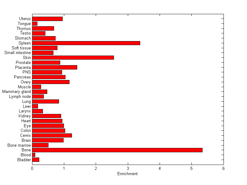 The expression level is normalized with tissue-library size. Each value for a gene in a tissue is a ratio of observed ESTs to the expected one in this tissue. The expected number of ESTs is the product of total ESTs of the gene and the fraction of total ESTs in the tissue among all ESTs in 30 tissues.