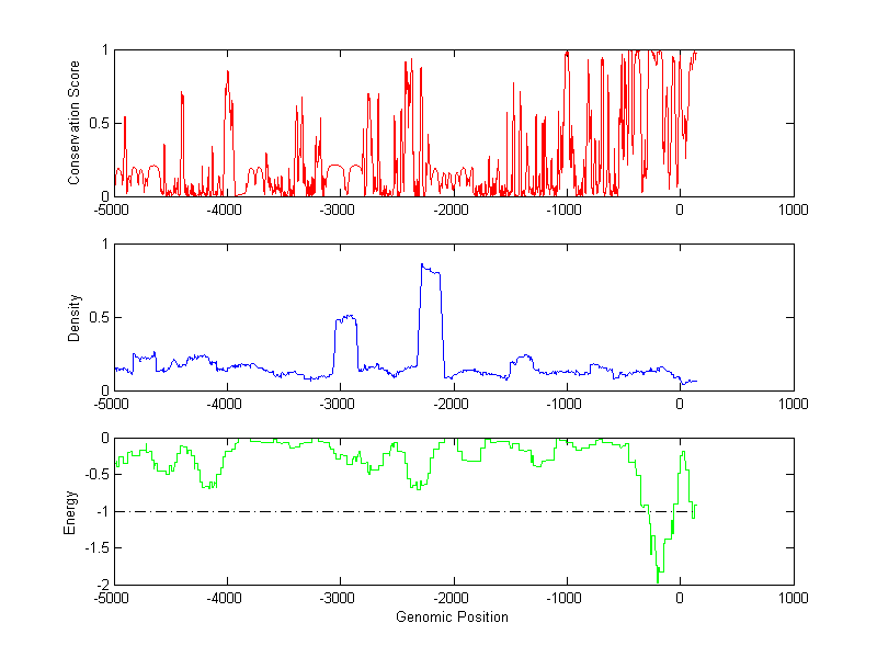 The energy profile (green curve) is about energy for module detection based on TF interaction. The positions with energy less than -1 indicate the existence of CRMs.