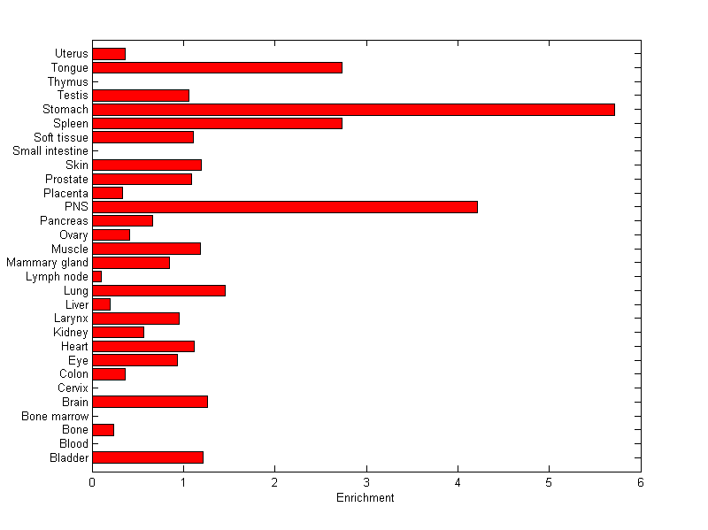 The expression level is normalized with tissue-library size. Each value for a gene in a tissue is a ratio of observed ESTs to the expected one in this tissue. The expected number of ESTs is the product of total ESTs of the gene and the fraction of total ESTs in the tissue among all ESTs in 30 tissues.