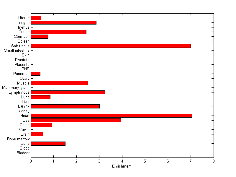 The expression level is normalized with tissue-library size. Each value for a gene in a tissue is a ratio of observed ESTs to the expected one in this tissue. The expected number of ESTs is the product of total ESTs of the gene and the fraction of total ESTs in the tissue among all ESTs in 30 tissues.