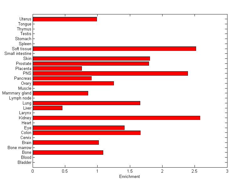 The expression level is normalized with tissue-library size. Each value for a gene in a tissue is a ratio of observed ESTs to the expected one in this tissue. The expected number of ESTs is the product of total ESTs of the gene and the fraction of total ESTs in the tissue among all ESTs in 30 tissues.