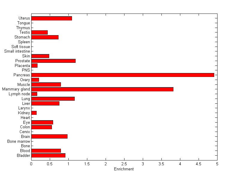 The expression level is normalized with tissue-library size. Each value for a gene in a tissue is a ratio of observed ESTs to the expected one in this tissue. The expected number of ESTs is the product of total ESTs of the gene and the fraction of total ESTs in the tissue among all ESTs in 30 tissues.