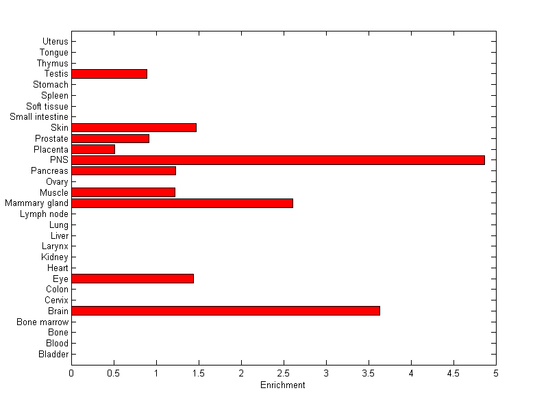 The expression level is normalized with tissue-library size. Each value for a gene in a tissue is a ratio of observed ESTs to the expected one in this tissue. The expected number of ESTs is the product of total ESTs of the gene and the fraction of total ESTs in the tissue among all ESTs in 30 tissues.