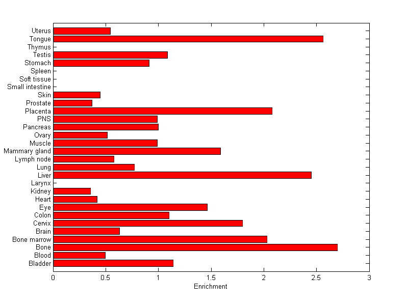The expression level is normalized with tissue-library size. Each value for a gene in a tissue is a ratio of observed ESTs to the expected one in this tissue. The expected number of ESTs is the product of total ESTs of the gene and the fraction of total ESTs in the tissue among all ESTs in 30 tissues.