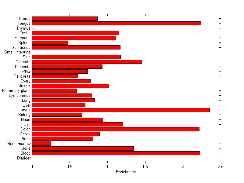 The expression level is normalized with tissue-library size. Each value for a gene in a tissue is a ratio of observed ESTs to the expected one in this tissue. The expected number of ESTs is the product of total ESTs of the gene and the fraction of total ESTs in the tissue among all ESTs in 30 tissues.