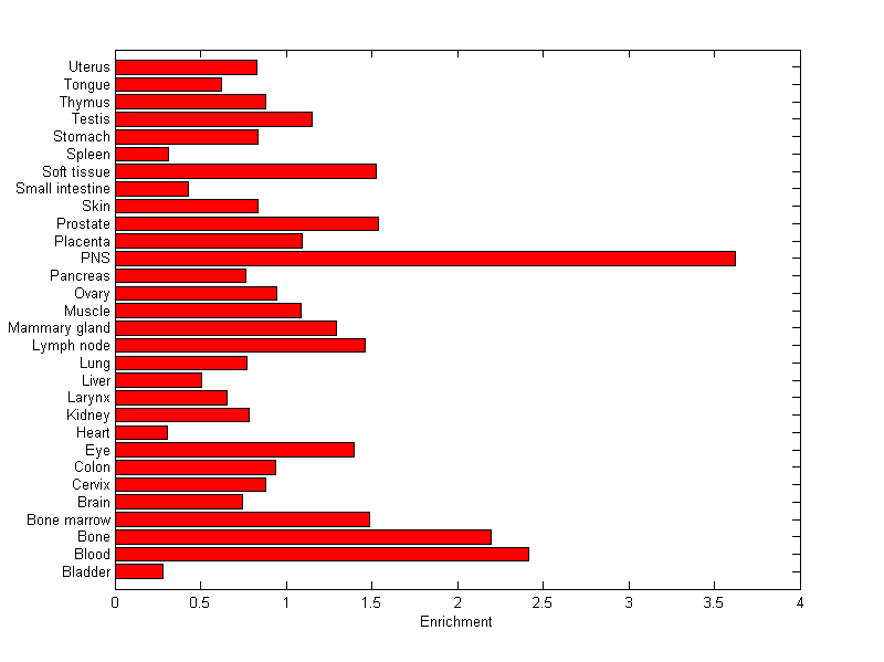 The expression level is normalized with tissue-library size. Each value for a gene in a tissue is a ratio of observed ESTs to the expected one in this tissue. The expected number of ESTs is the product of total ESTs of the gene and the fraction of total ESTs in the tissue among all ESTs in 30 tissues.