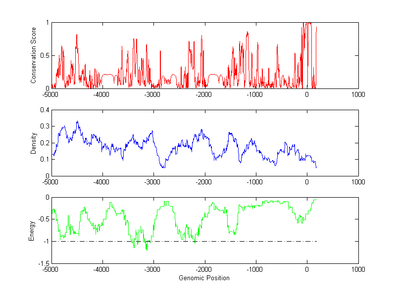 The energy profile (green curve) is about energy for module detection based on TF interaction. The positions with energy less than -1 indicate the existence of CRMs.