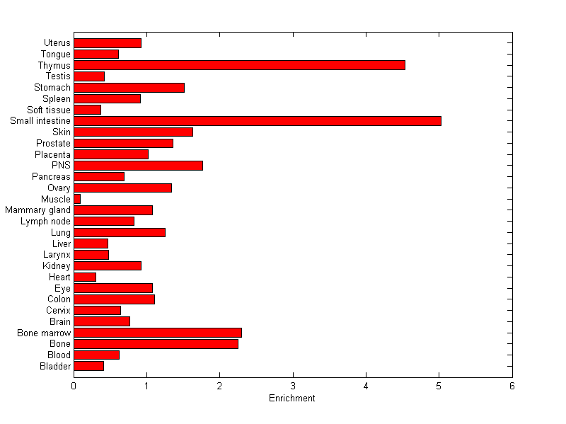 The expression level is normalized with tissue-library size. Each value for a gene in a tissue is a ratio of observed ESTs to the expected one in this tissue. The expected number of ESTs is the product of total ESTs of the gene and the fraction of total ESTs in the tissue among all ESTs in 30 tissues.