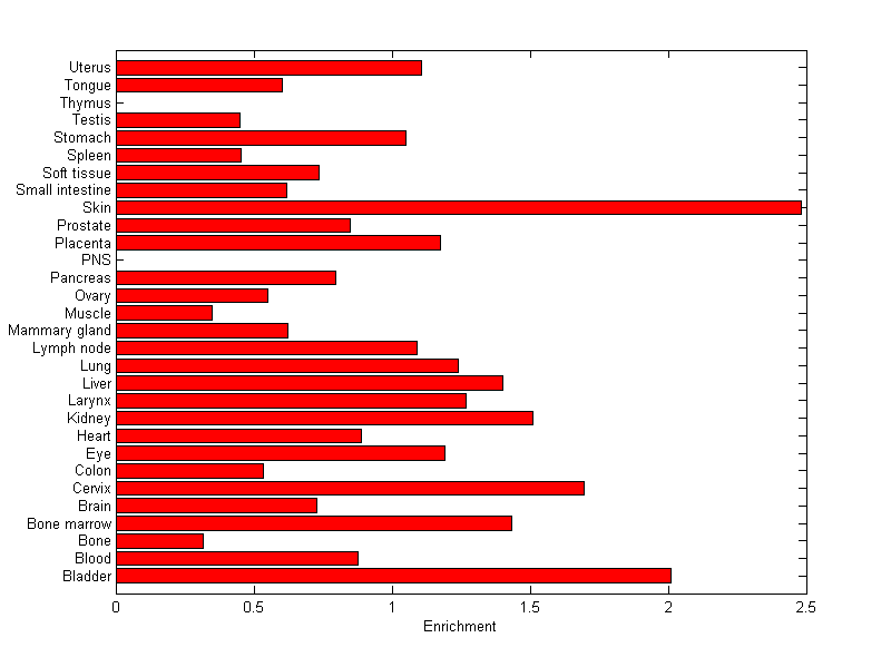 The expression level is normalized with tissue-library size. Each value for a gene in a tissue is a ratio of observed ESTs to the expected one in this tissue. The expected number of ESTs is the product of total ESTs of the gene and the fraction of total ESTs in the tissue among all ESTs in 30 tissues.