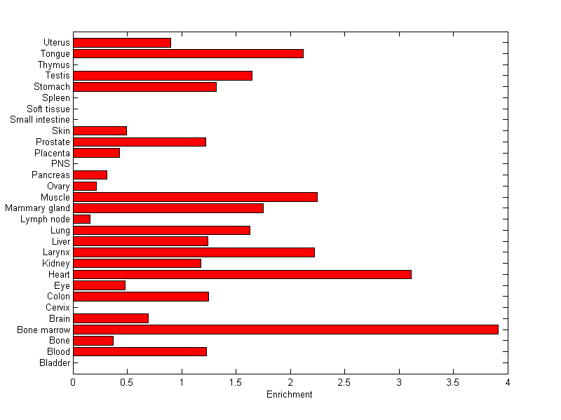 The expression level is normalized with tissue-library size. Each value for a gene in a tissue is a ratio of observed ESTs to the expected one in this tissue. The expected number of ESTs is the product of total ESTs of the gene and the fraction of total ESTs in the tissue among all ESTs in 30 tissues.