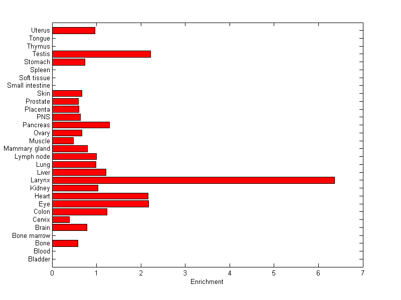 The expression level is normalized with tissue-library size. Each value for a gene in a tissue is a ratio of observed ESTs to the expected one in this tissue. The expected number of ESTs is the product of total ESTs of the gene and the fraction of total ESTs in the tissue among all ESTs in 30 tissues.