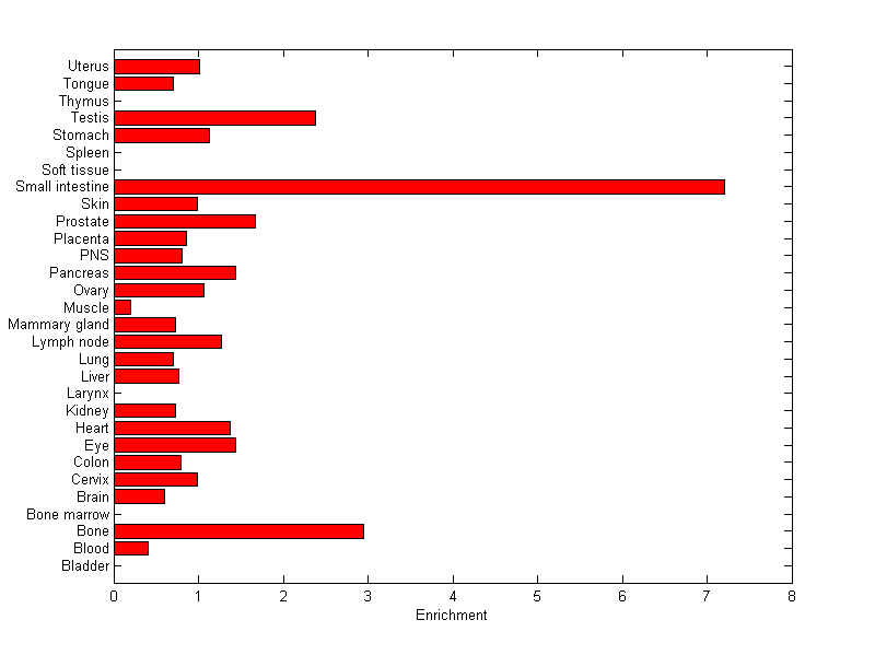 The expression level is normalized with tissue-library size. Each value for a gene in a tissue is a ratio of observed ESTs to the expected one in this tissue. The expected number of ESTs is the product of total ESTs of the gene and the fraction of total ESTs in the tissue among all ESTs in 30 tissues.