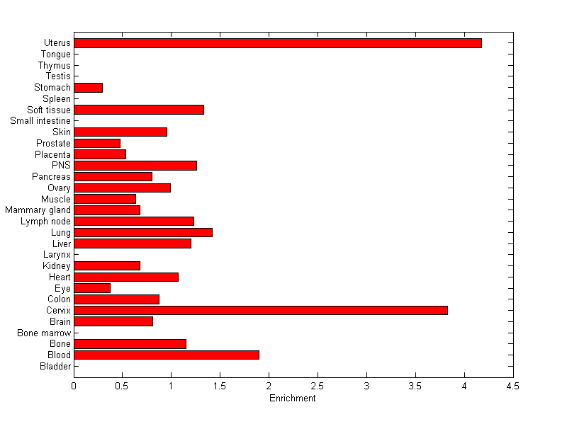 The expression level is normalized with tissue-library size. Each value for a gene in a tissue is a ratio of observed ESTs to the expected one in this tissue. The expected number of ESTs is the product of total ESTs of the gene and the fraction of total ESTs in the tissue among all ESTs in 30 tissues.