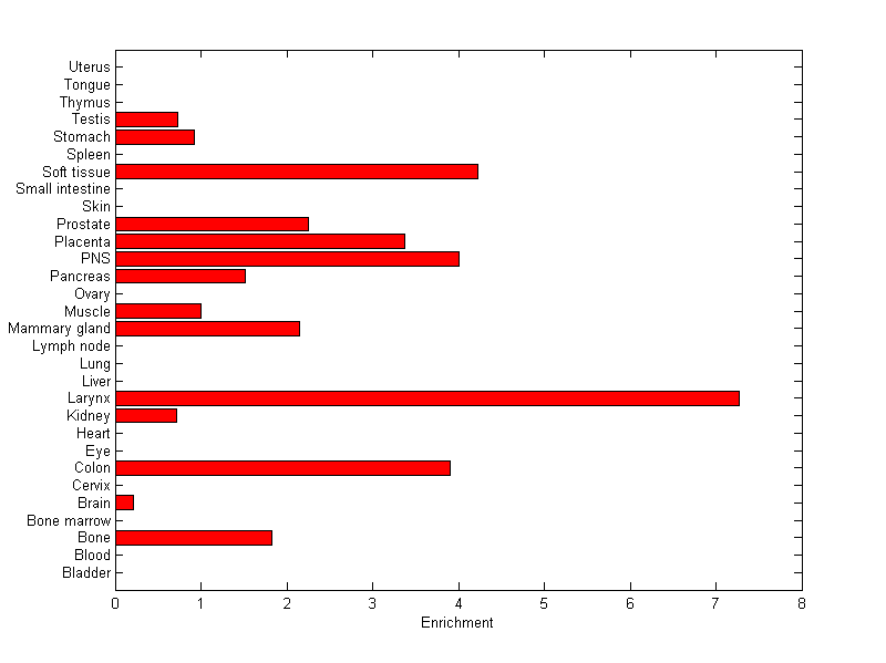 The expression level is normalized with tissue-library size. Each value for a gene in a tissue is a ratio of observed ESTs to the expected one in this tissue. The expected number of ESTs is the product of total ESTs of the gene and the fraction of total ESTs in the tissue among all ESTs in 30 tissues.