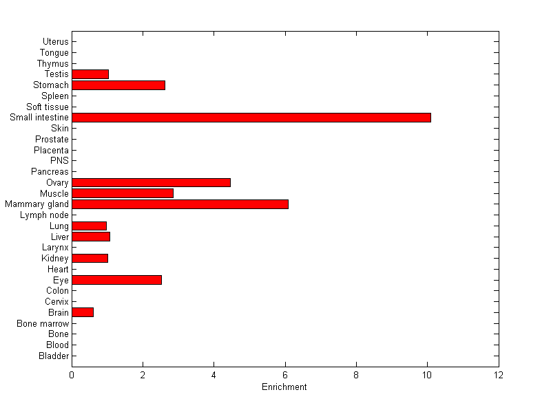The expression level is normalized with tissue-library size. Each value for a gene in a tissue is a ratio of observed ESTs to the expected one in this tissue. The expected number of ESTs is the product of total ESTs of the gene and the fraction of total ESTs in the tissue among all ESTs in 30 tissues.