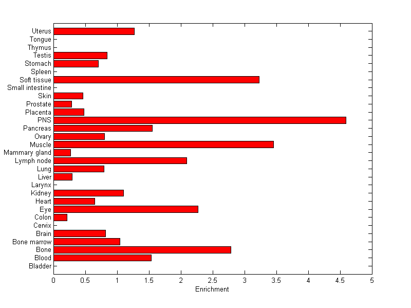 The expression level is normalized with tissue-library size. Each value for a gene in a tissue is a ratio of observed ESTs to the expected one in this tissue. The expected number of ESTs is the product of total ESTs of the gene and the fraction of total ESTs in the tissue among all ESTs in 30 tissues.