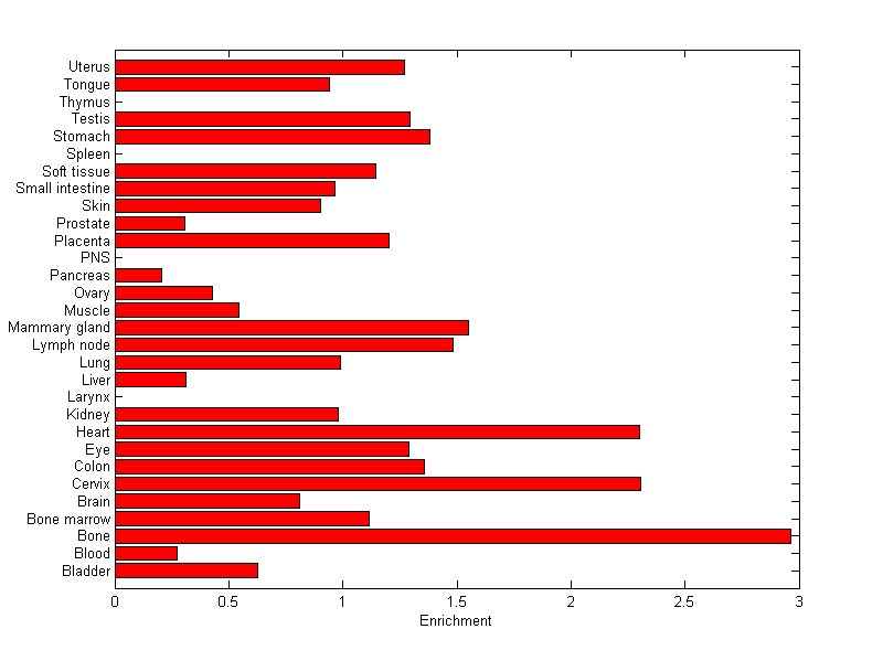 The expression level is normalized with tissue-library size. Each value for a gene in a tissue is a ratio of observed ESTs to the expected one in this tissue. The expected number of ESTs is the product of total ESTs of the gene and the fraction of total ESTs in the tissue among all ESTs in 30 tissues.