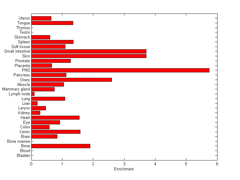 About the profile: The expression level is normalized with tissue-library size. Each value for a gene in a tissue is a ratio of observed ESTs to the expected one in this tissue. The expected number of ESTs is the product of total ESTs of the gene and the fraction of total ESTs in the tissue among all ESTs in 30 tissues. Summary: This gene is preferentially expressed in [peripheral_nervous_system] Download: |