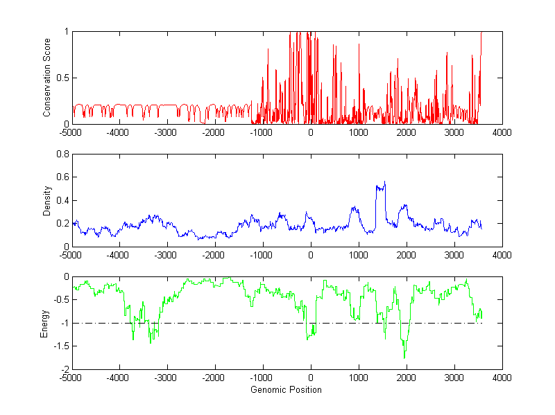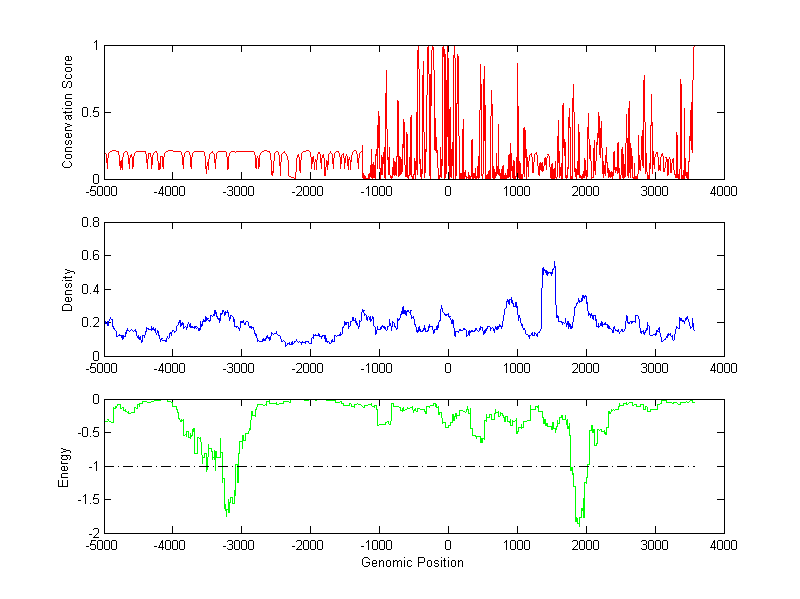 About the profiles: The conservation profile (red curve) is about conservation scores of the promoter sequences. Conservation was determined from an eight-way alignment of human, chimpanzee, dog, mouse, rat, chicken, zebrafish and fugu sequences. The conservation was quantified by a conservation score between 0 and 1, with 1 as highest conservation. The conservation score was obtained from UCSC genome databases. The density profile (blue curve) is about density of all TF binding sites. The energy profile (green curve) is about energy for module detection based on TF interaction. The positions with energy less than -1 indicate the existence of CRMs. Download: Conservation profileDensity profile Energy profile CRM summary |