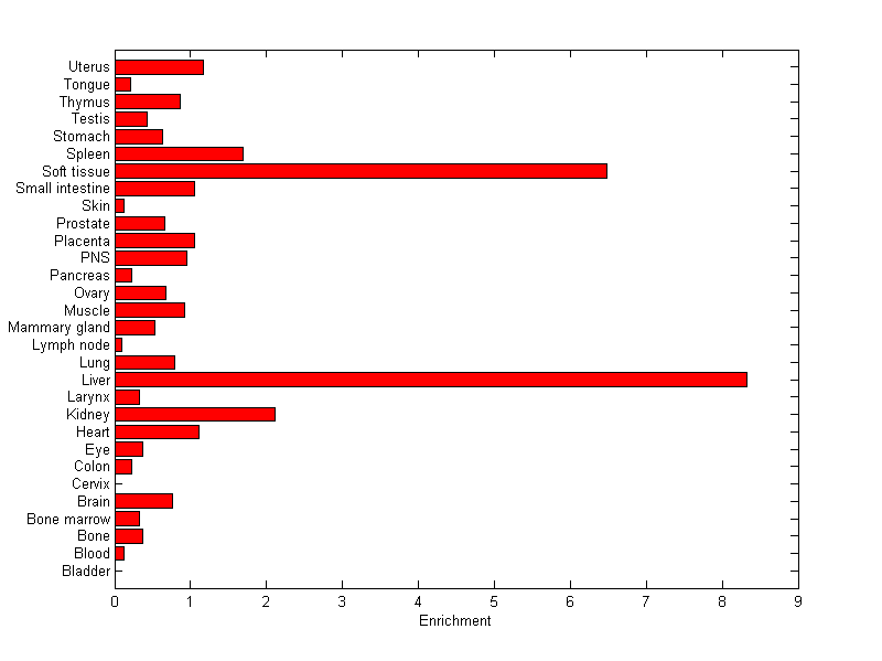 About the profile: The expression level is normalized with tissue-library size. Each value for a gene in a tissue is a ratio of observed ESTs to the expected one in this tissue. The expected number of ESTs is the product of total ESTs of the gene and the fraction of total ESTs in the tissue among all ESTs in 30 tissues. Summary: This gene is preferentially expressed in [liver, soft_tissue] Download: |